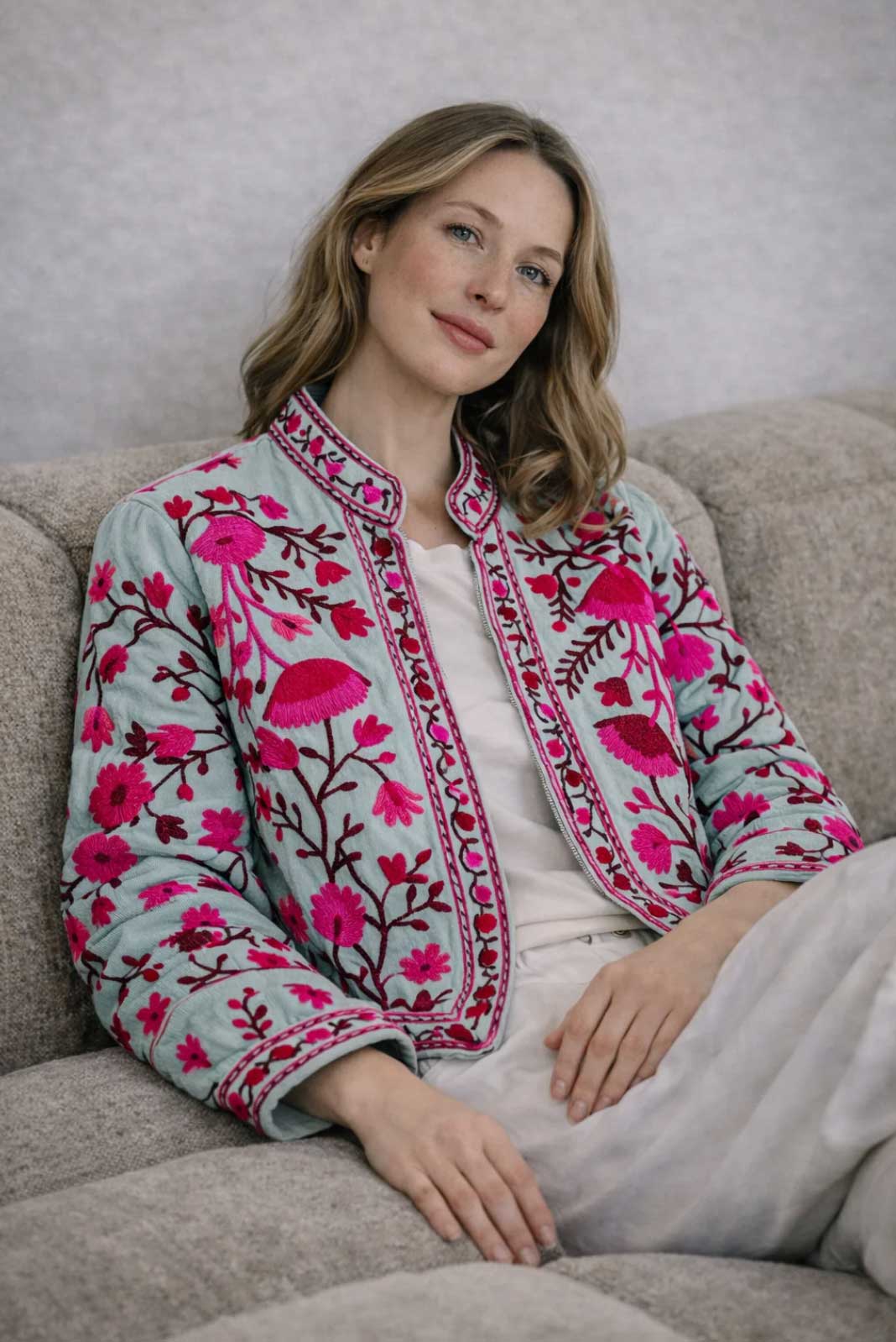 The floral embroidery appears vibrant and feminine, lending the jacket an expressive, almost painterly character. Each shade of color unfolds its own depth against the light background, creating a unique interplay between delicacy and intensity.